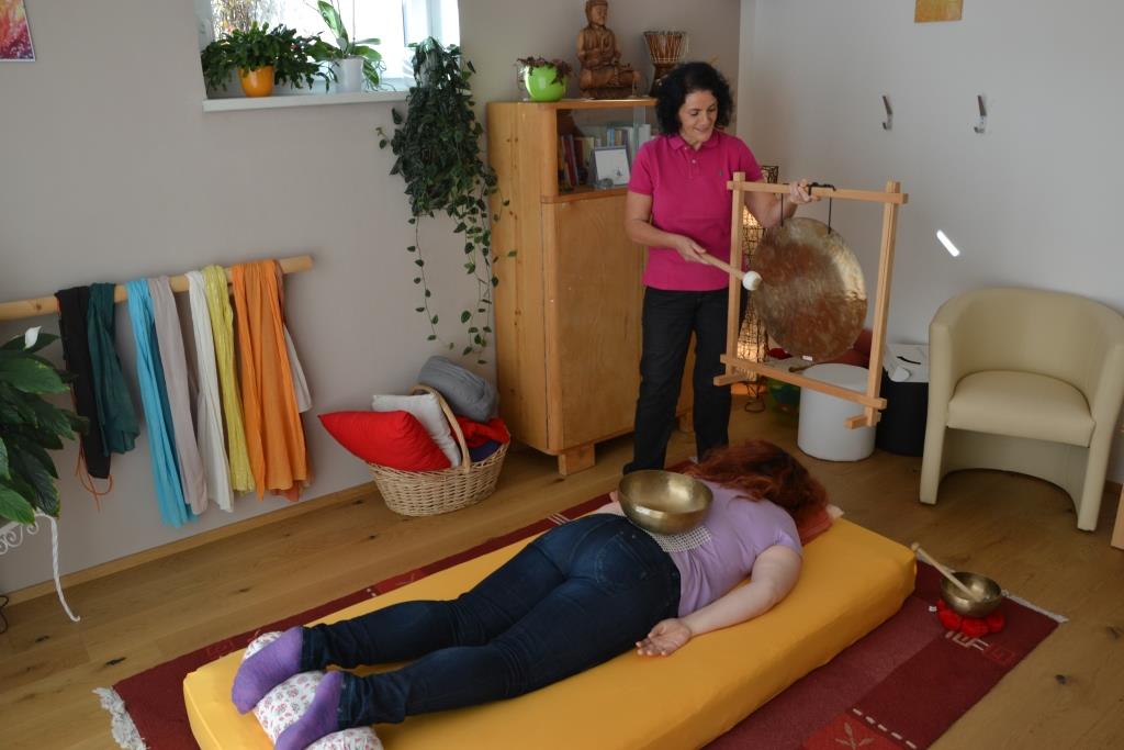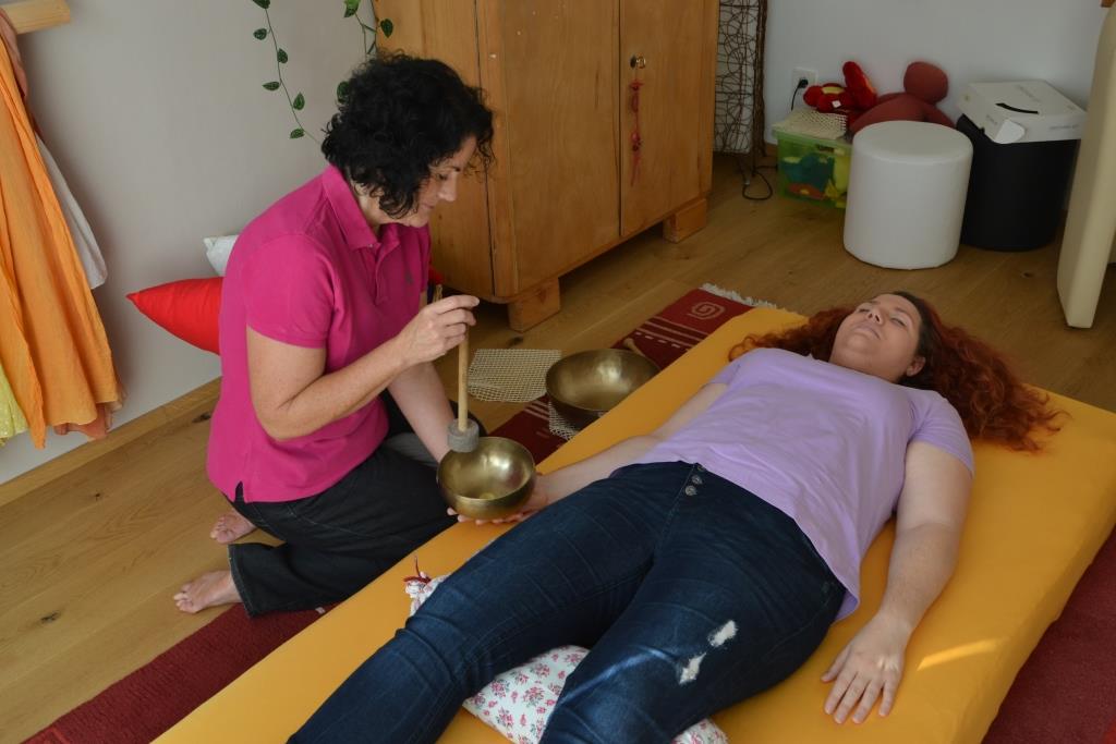 Durch das Anschlagen der Klangschale wird der Körper sanft massiert und die Schwingung breitet sich im ganzen Körper aus und bringt somit alle Zellen in Einklang.